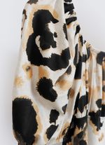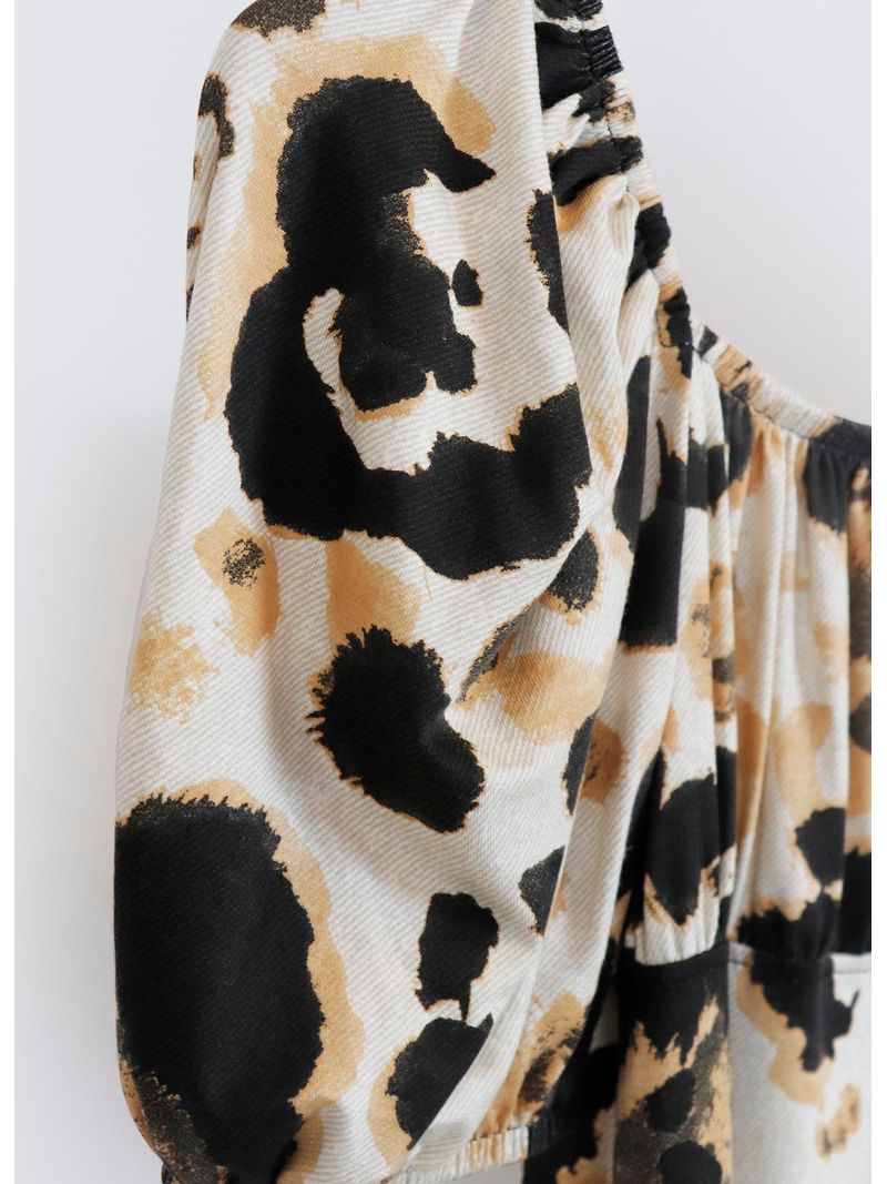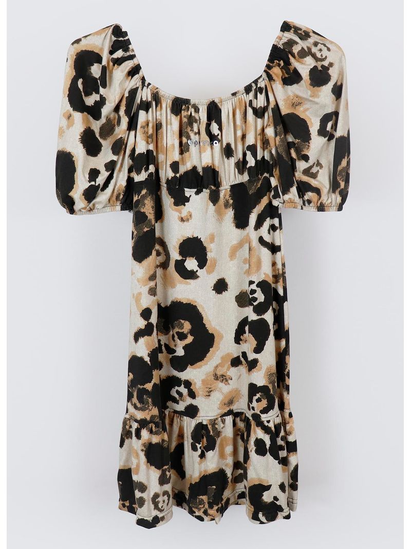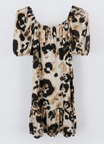 Vestido manga curta de viscose estampado. Mangas bufante. Decote reto. Saia com babados. Detalhe frontal com o logo Perfumaria em alto relevo.