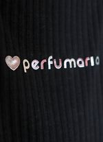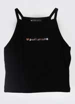 Cropped canelado com alças finas e escrita espelhada perfumaria.