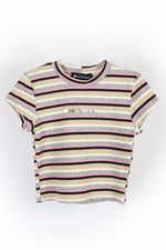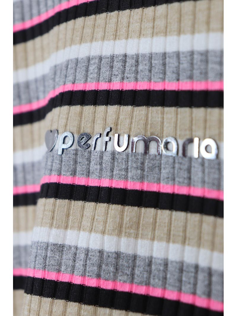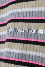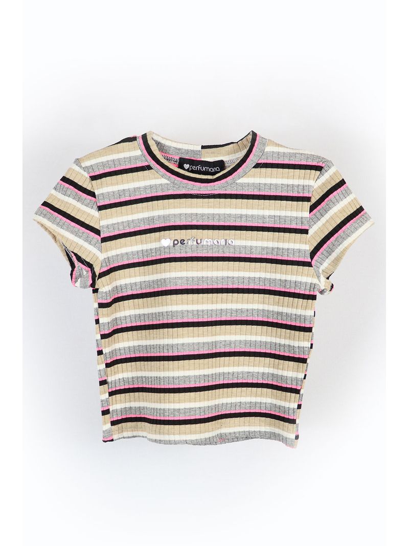 Cropped canelado listrado em mescla, rosa neon, preto e ocre. Detalhe para escrita Perfumaria na frente.