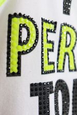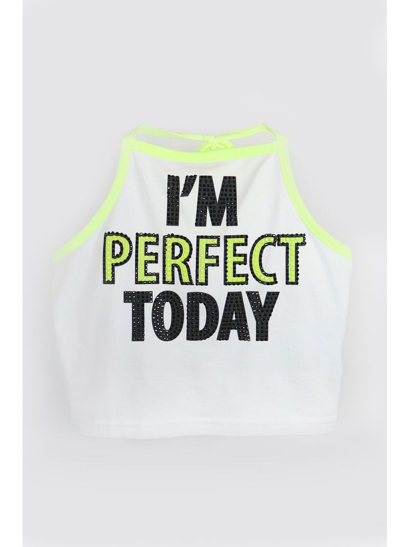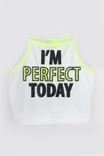 Cropped de cotton com serigrafia Im perfect today e aplique de cristais. Detalhe para debrum amarelo neon e amarração.