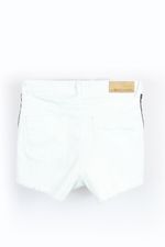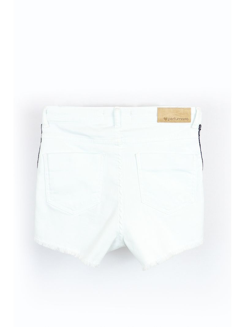 Short saia de sarja branco, com tira lateral de tricot preto e e escrita Perfumaria em lurex. Na parte de trás bolsos e etiqueta de couro Perfumaria.
